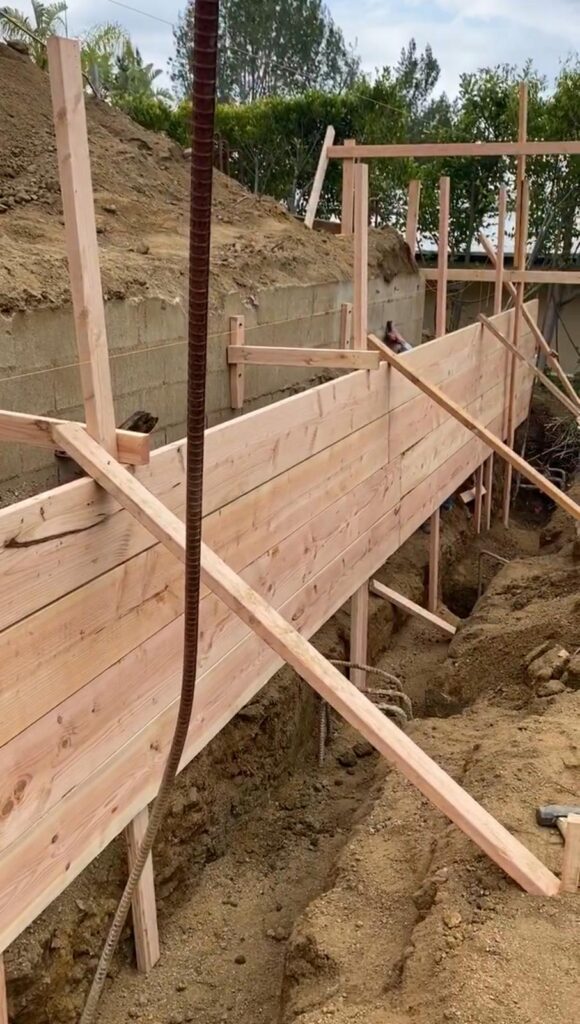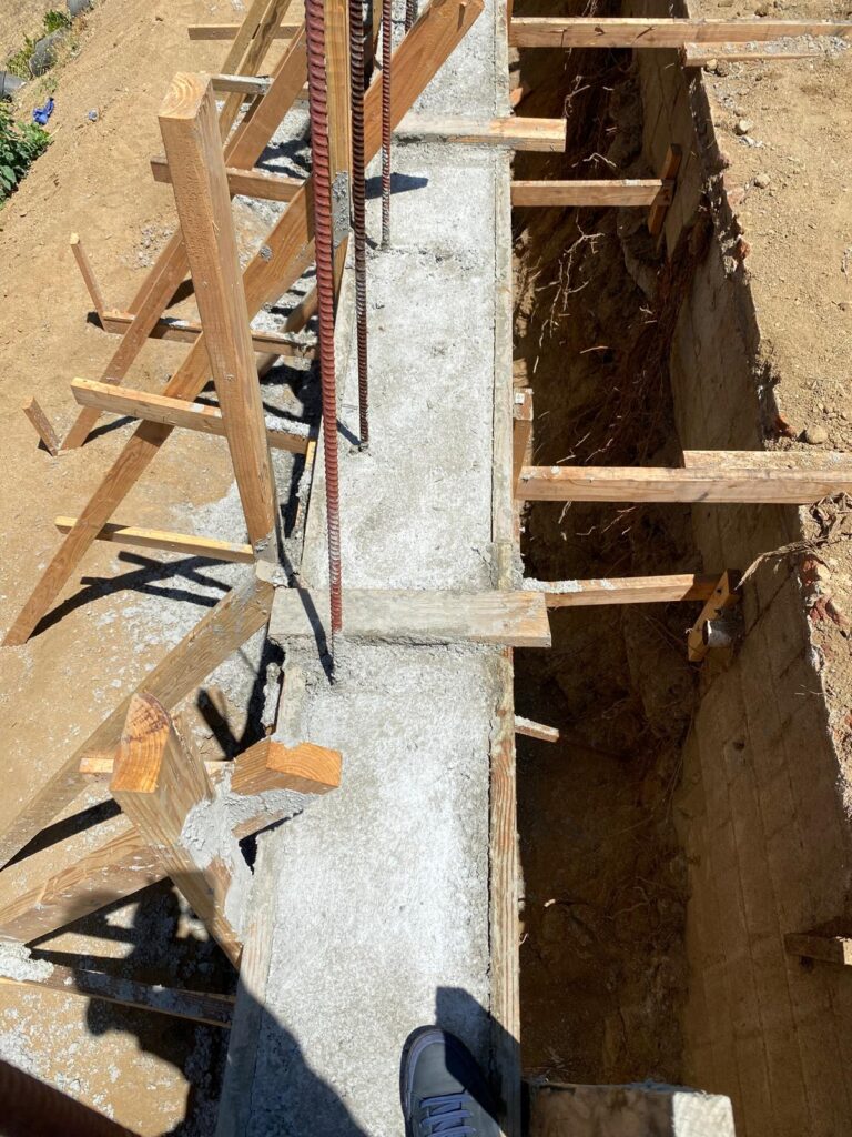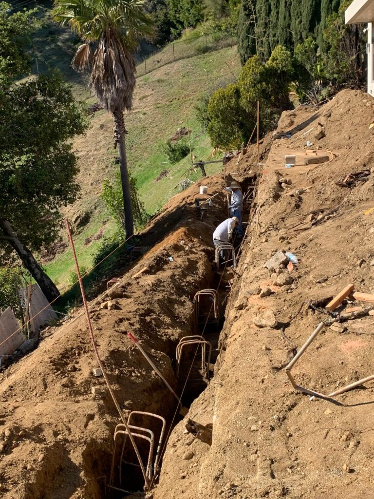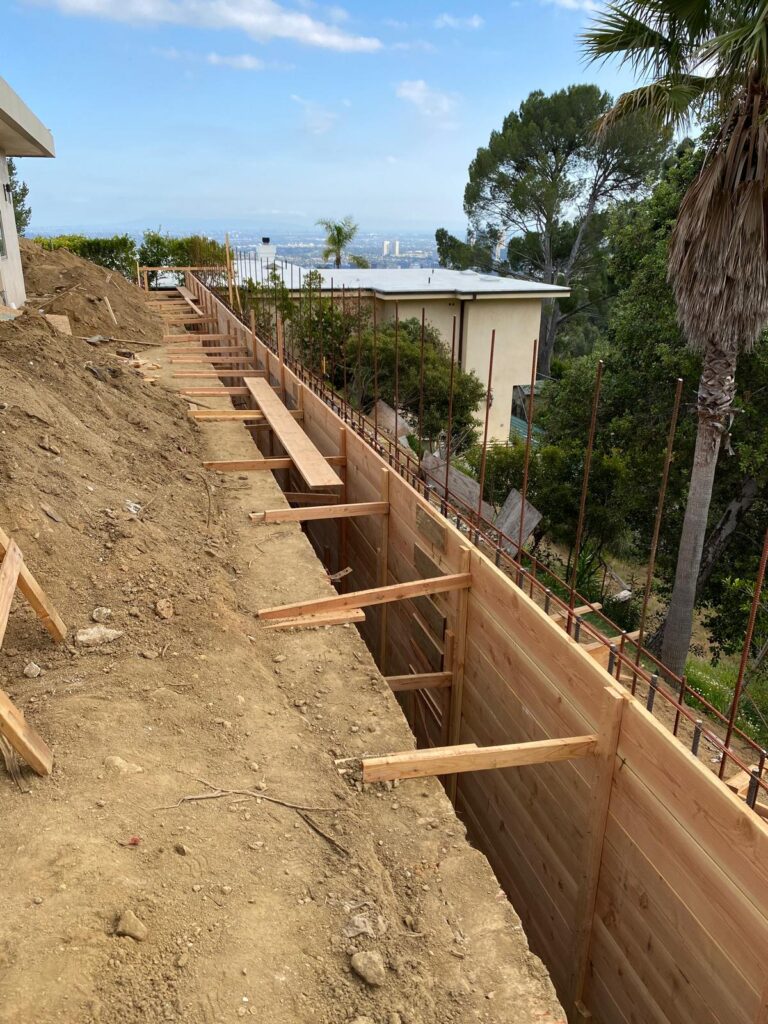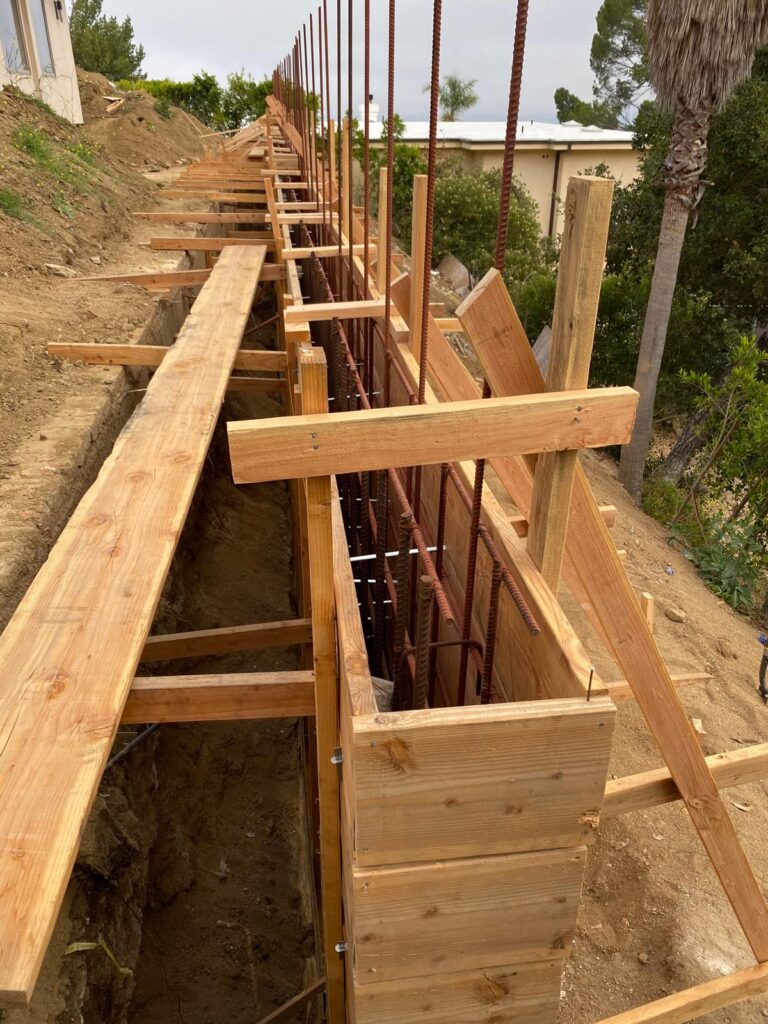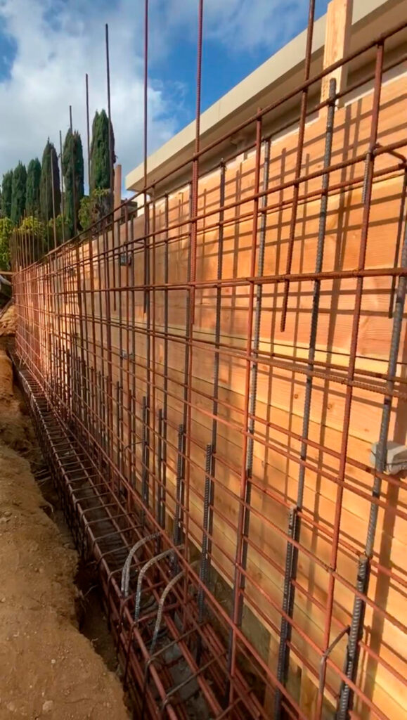 This retaining wall project by Golden Gate General Construction Inc. was a cornerstone of transforming a hillside property into a stunning and functional space. Located in Carla Ridge, Trousdale Estates, the 12-inch thick, 110-foot-long retaining wall was essential for creating the foundation for a future infinity zero-edge swimming pool and expanding the backyard space. Despite the challenges of working on a hillside and the complexity of the engineering, our team installed 24 caissons, each 32 inches in diameter and 28 feet deep into the bedrock, using 16-inch number 8 rebars for reinforcement. Due to hauling restrictions, we could only pour five yards of concrete at a time, requiring careful planning and execution. The result is a beautifully reinforced structure that sets the stage for luxury and elegance.