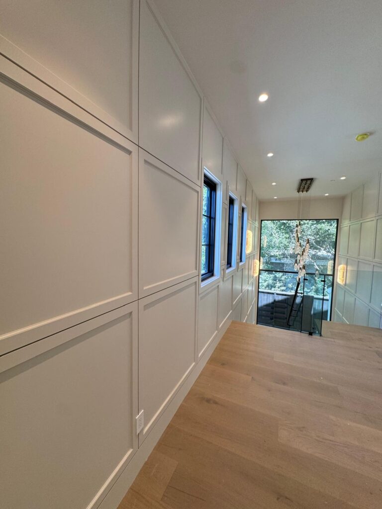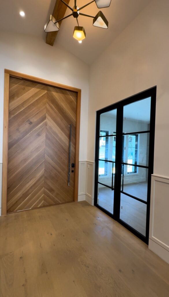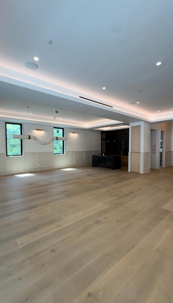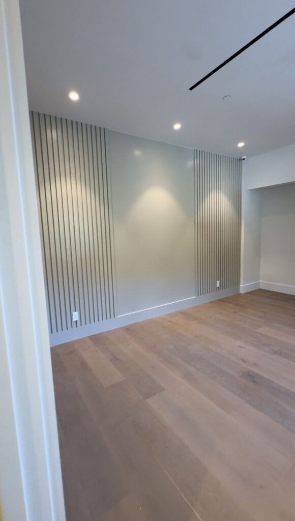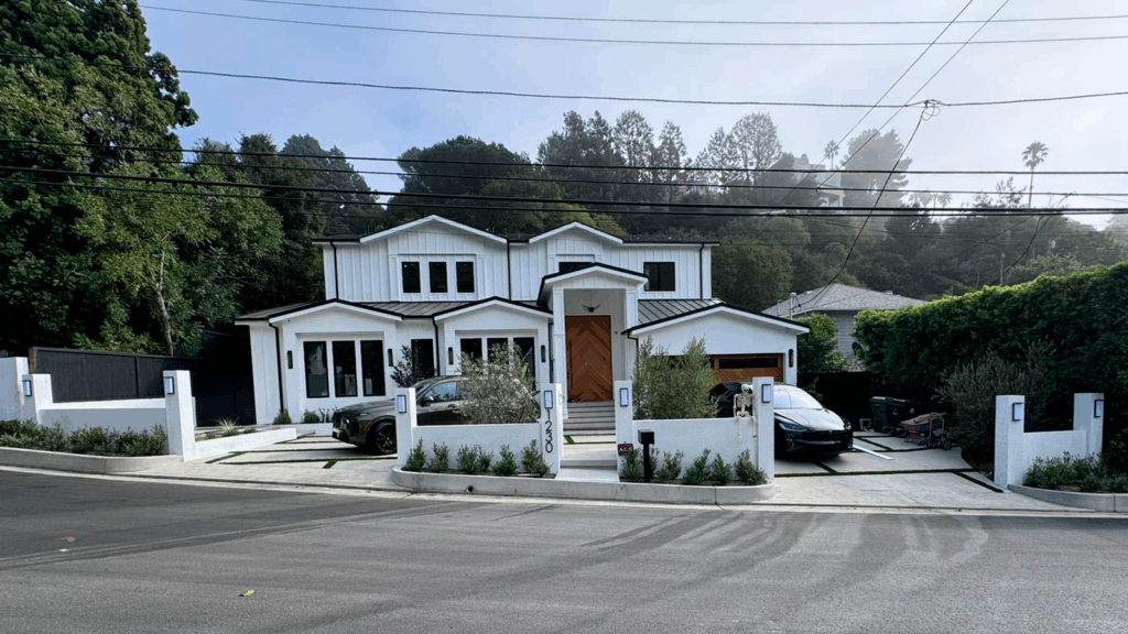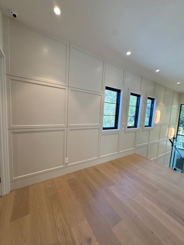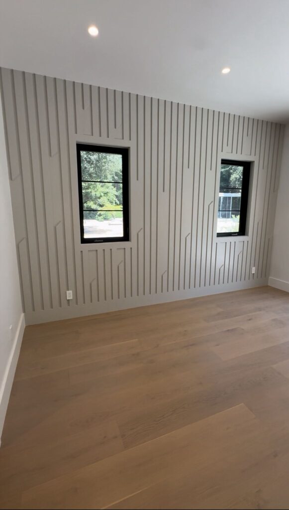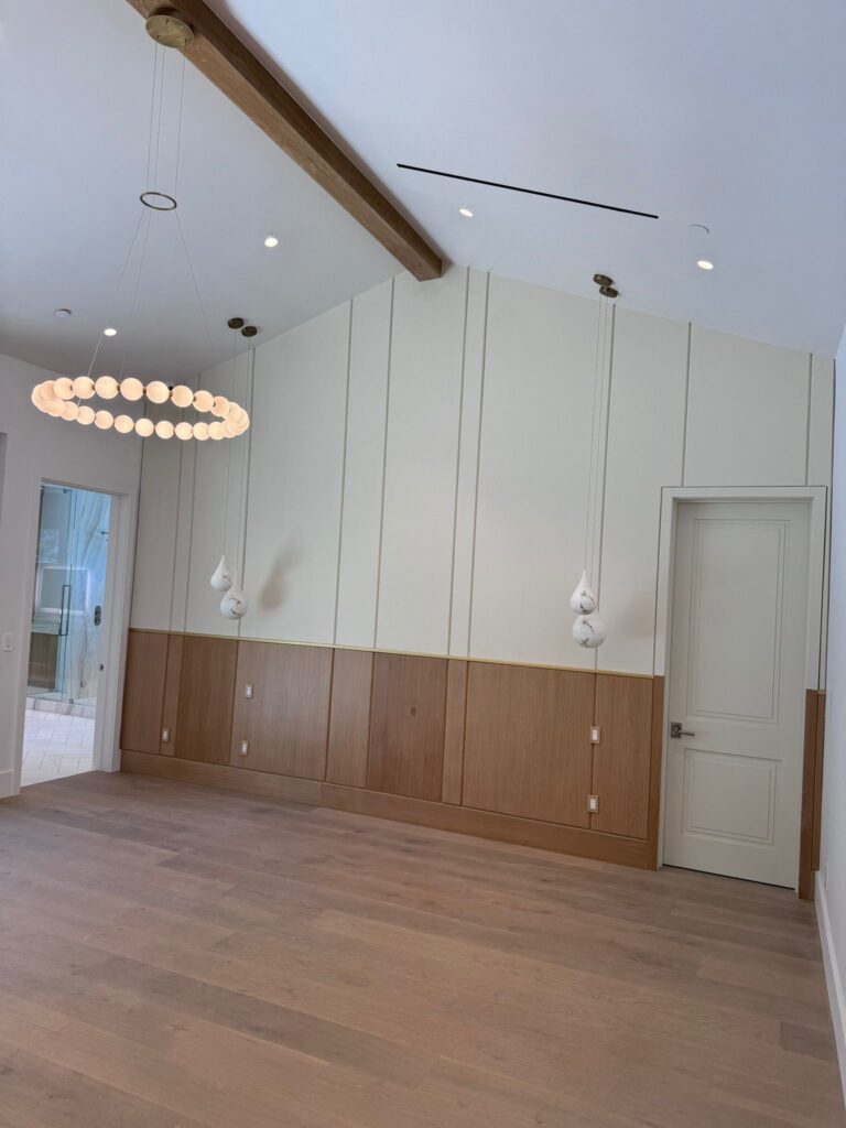 The exterior blends modern and farmhouse aesthetics with clean white board and batten siding, black window frames, and warm wood accents on the front door and garage. We expanded the backyard by 25 feet in depth and 100 feet in width, adding a stunning retaining wall to create space for a new swimming pool. Inside, we incorporated elegant wainscoting, special accent walls, and indirect lighting, along with a high-quality sound system and a low-voltage security system. All of these systems can be controlled conveniently from tablets, adding a modern touch of convenience.