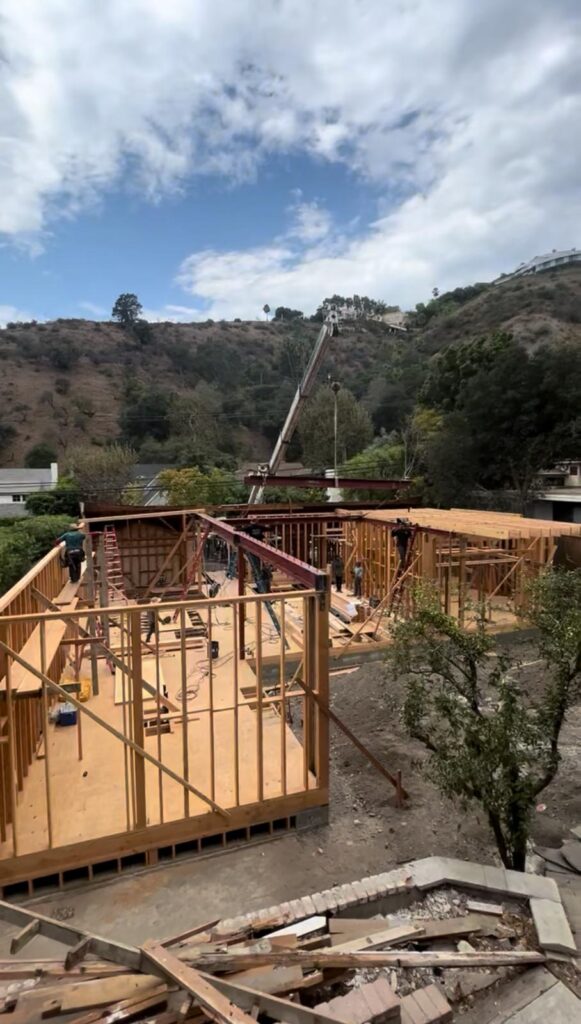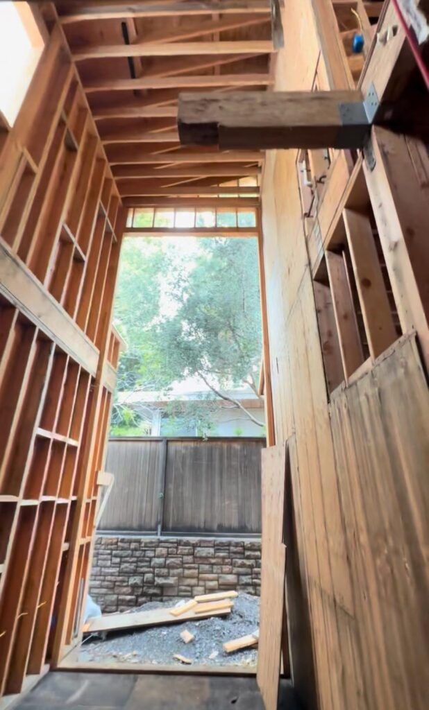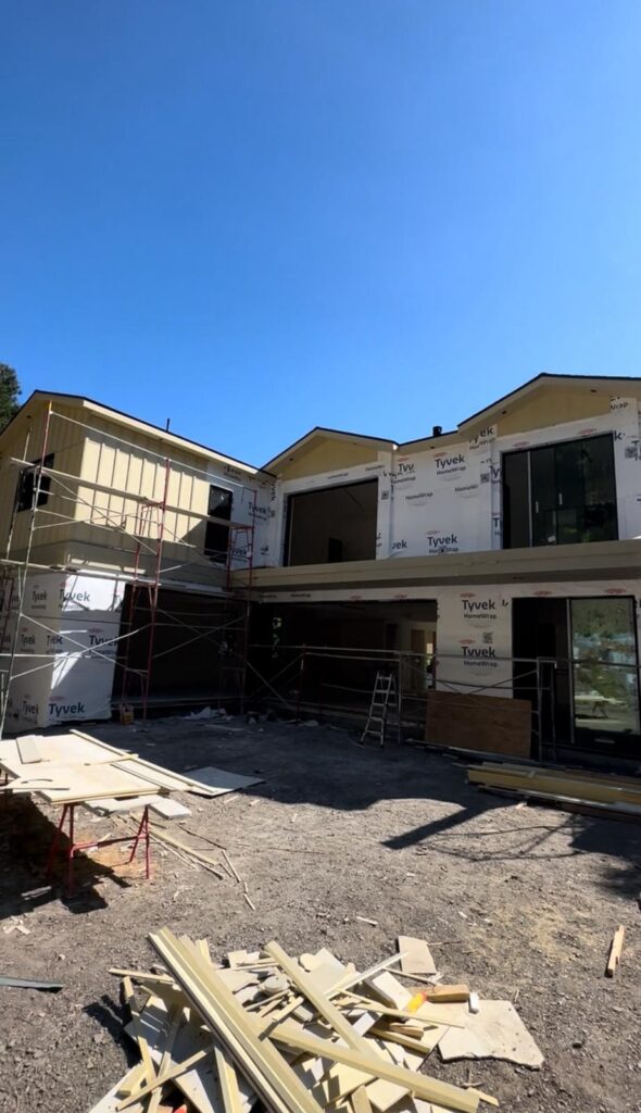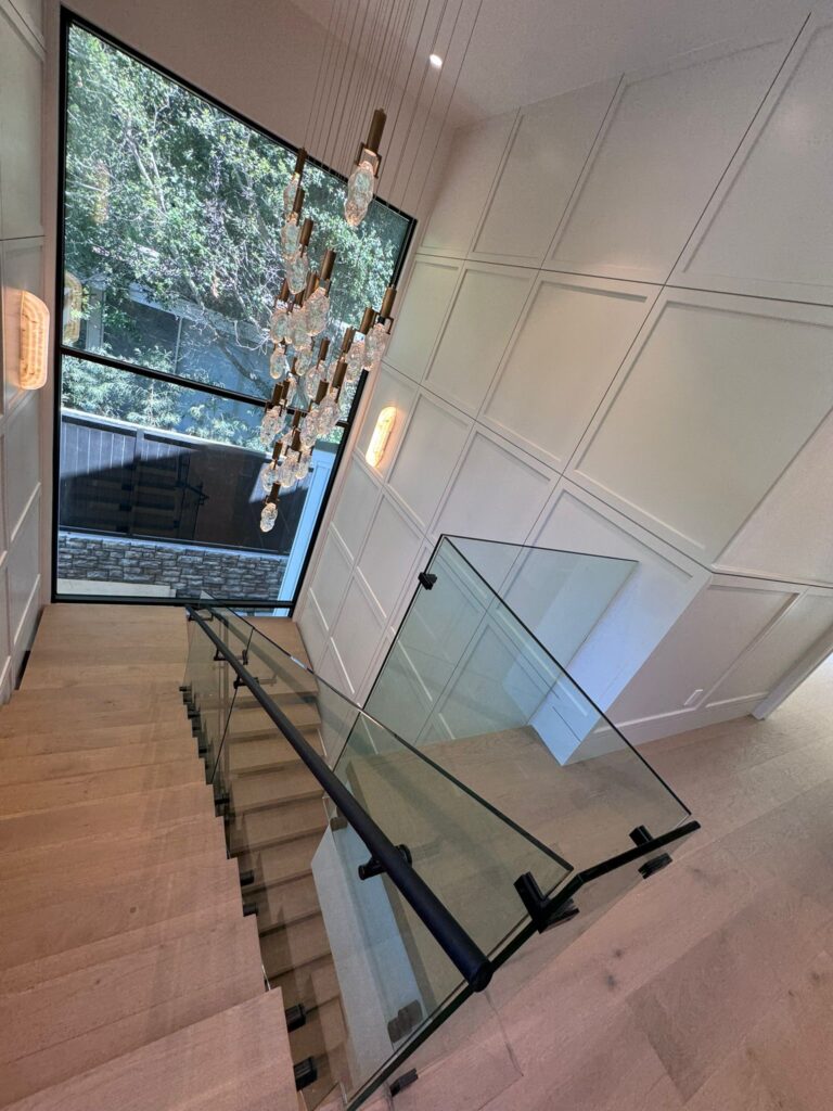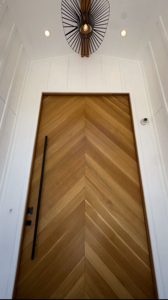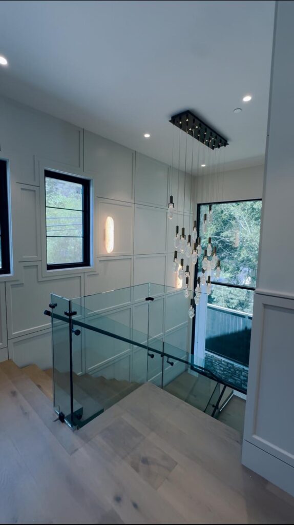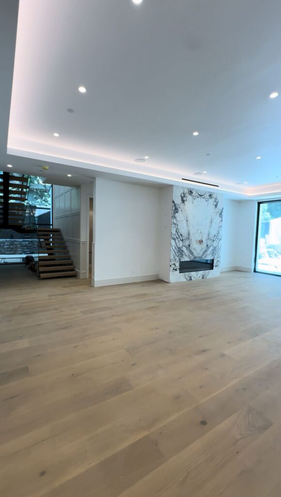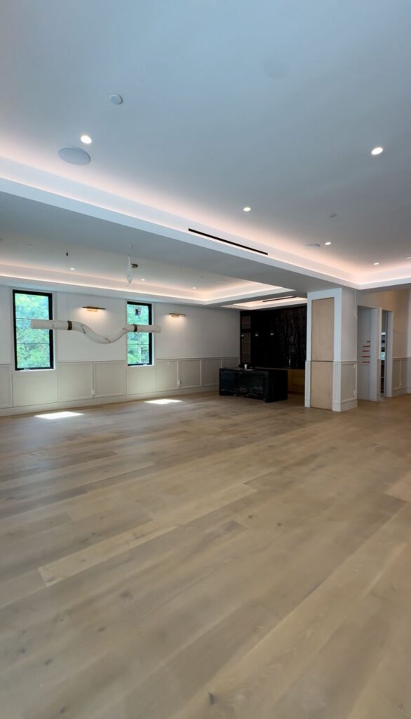 The exterior blends modern and farmhouse aesthetics with clean white board and batten siding, black window frames, and warm wood accents on the front door and garage. We expanded the backyard by 25 feet in depth and 100 feet in width, adding a stunning retaining wall to create space for a new swimming pool. Inside, we incorporated elegant wainscoting, special accent walls, and indirect lighting, along with a high-quality sound system and a low-voltage security system. All of these systems can be controlled conveniently from tablets, adding a modern touch of convenience.